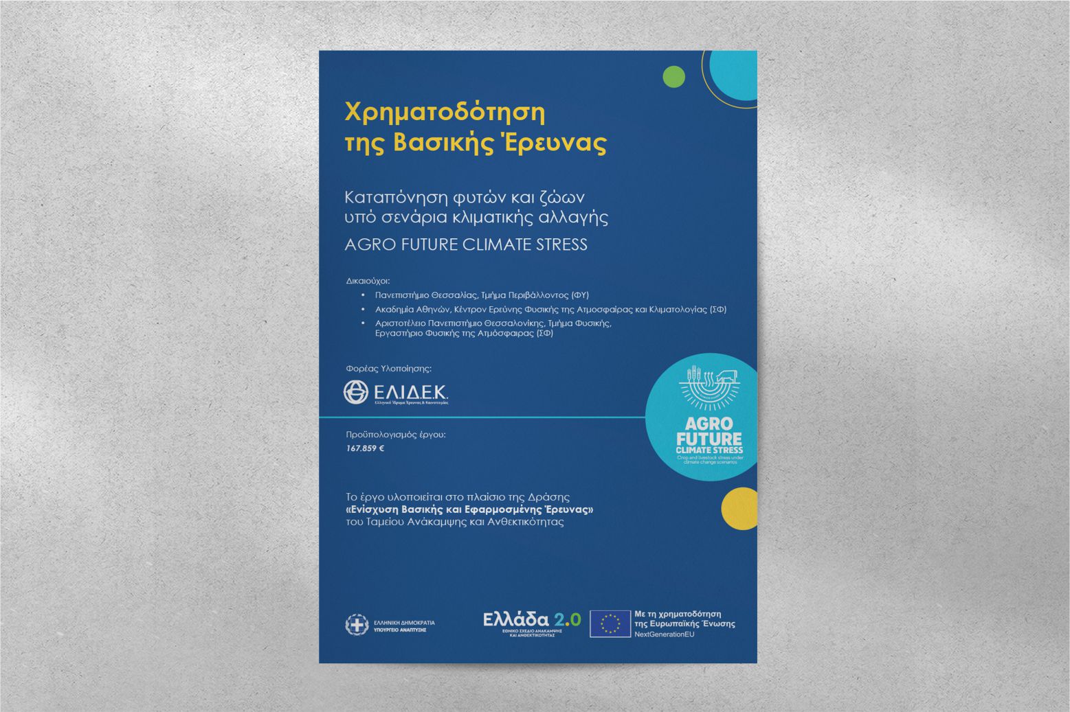 In the context of the Agro Future Climate Stress project, the project poster was designed and produced, according to the H.F.R.I. standard. The poster provides information on the identity of the Action and the funding bodies of the project.